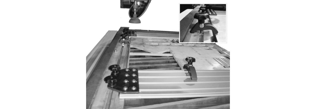 Designed specifically for your machine size, each Material Holding Kit includes track assemblies and vertical load clamping arms. The kit mounts into the waterjet slat bed with two X-axis tracks, two Y-axis tracks, and four short vertical load clamps.